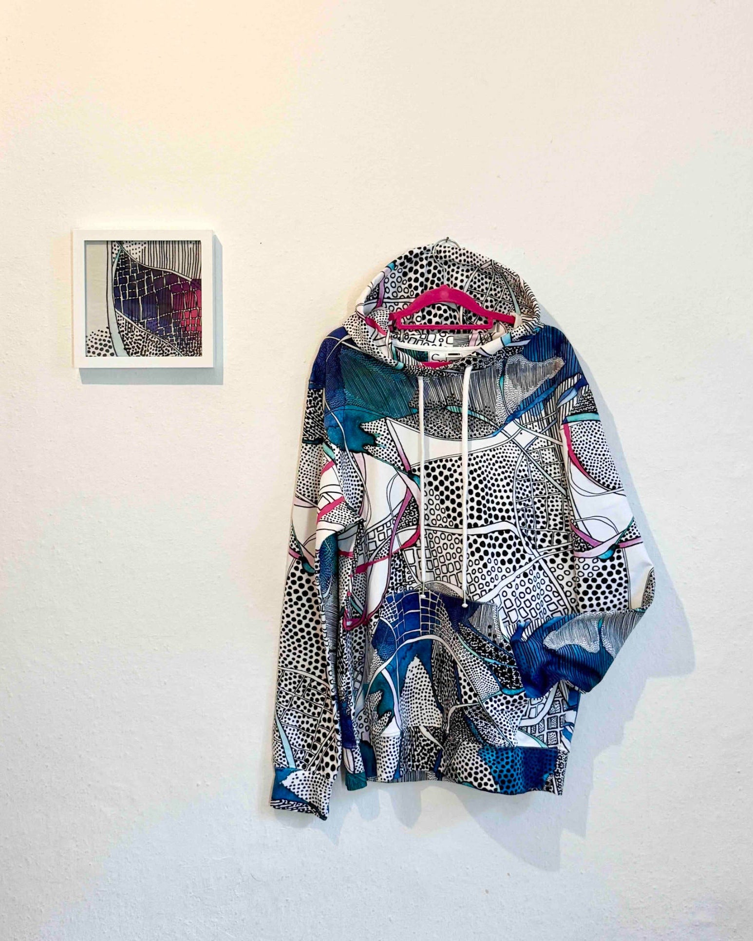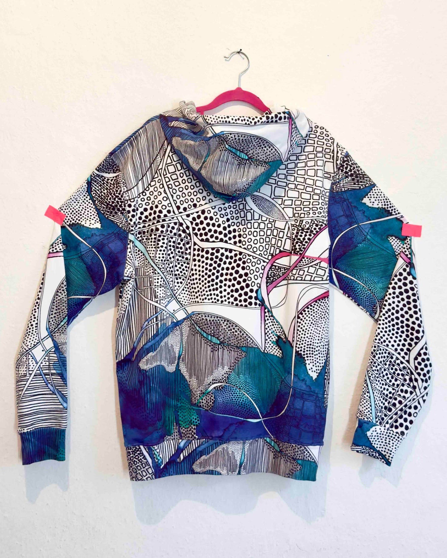 The quadraphonic print celebrates the diversity and vibrant colors of our natural world. It serves as a reminder that vitality, change, and interconnectedness are the foundation of a sustainable society. This hoodie makes this idea visible – as an expression of regeneration and optimism.