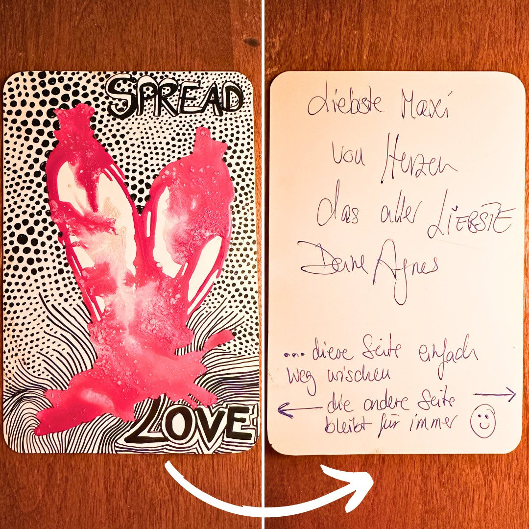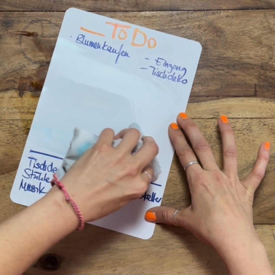 Theoretically, you can write on it with a ballpoint pen, pencil, or fineliner. But the real trick is wiping it off. For that, you need heat-sensitive ink like the Pilot Frixion or similar pens. You can find these pens (the ones with an eraser at the end) everywhere these days. You can also order them from us. They write incredibly smoothly, and everything disappears with a damp cloth.
