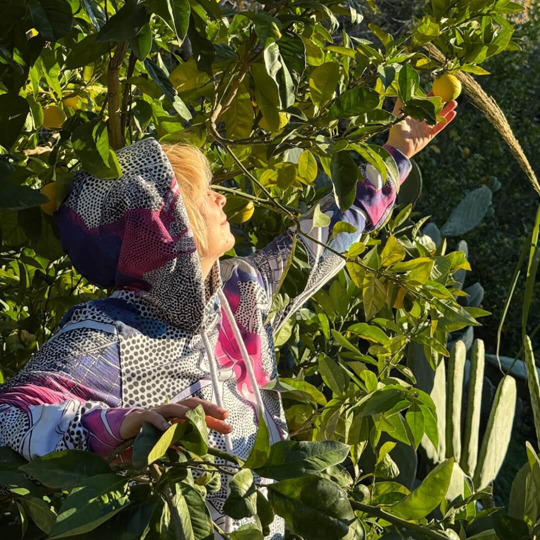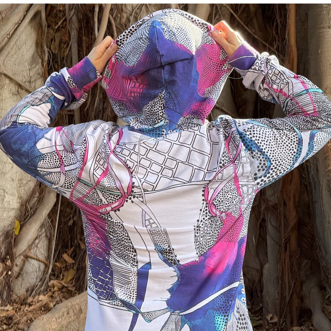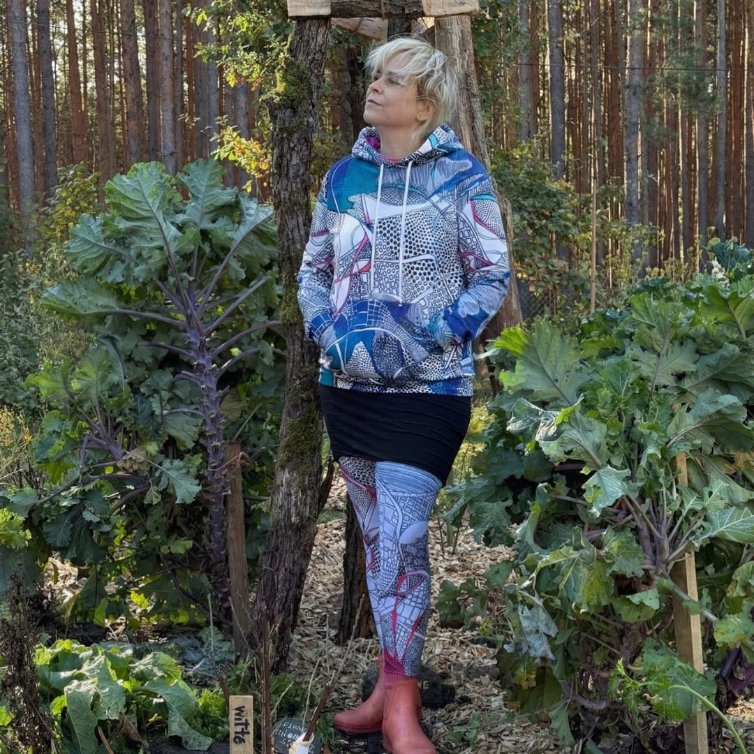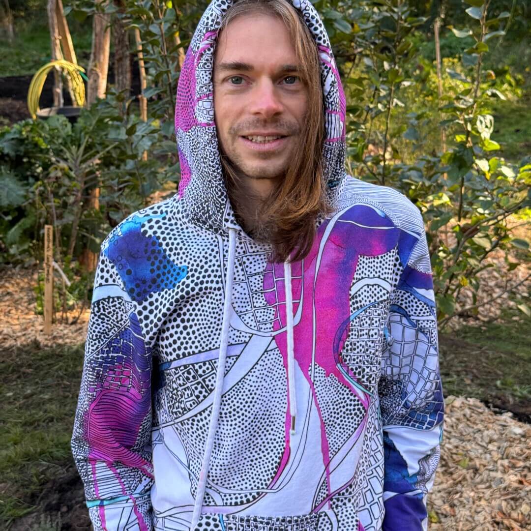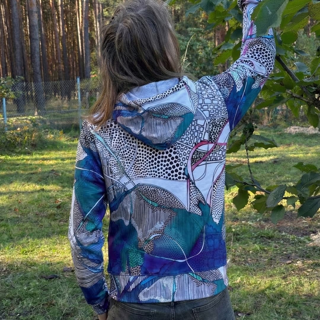 Ein echtes Kunstwerk auf Stoff. Agnes Friedrichs „Quadrophonie“ steht für die Komplexität lebendiger Ökosysteme. Ein visuelles Statement für regenerative Kultur statt kurzlebiger Trends.