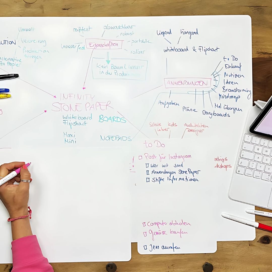 Die großen Infinity Stonepaper Boards eignen sich als portable Whiteboards an der Wand und als robuste Schreibunterlage. Sie sind dabei ideal für Brainstormings, Pläne, Gruppen- und Projektarbeiten. Nutzt sie auch im Freien für Ankündigungen, als Informationstafeln und vieles mehr.